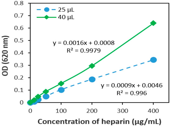 In this study, two different volumes of the heparin standard (25 µL and/or 40 µL) were used in triplicate (n = 3) to determine the desired sample volume. A calibration curve was generated by plotting a graph of optical density versus heparin concentration. It is evident that the absorbance or optical density (OD) of a light-absorbing material determined according to the Beer-Lambert’s law is directly proportional to the solute concentration in the solution [28]. As seen in Figure 1, the optical density of 40 µL of the sample and AB dye solution was higher than that of 25 µL of the sample, and the correlation coefficient for 25 µL of sample and 40 µL of sample was calculated as 0.996 and 0.998, respectively. Test results show that 25 µL of sample and 25 µL of AB dye solution had comparatively lower optical density. Therefore, the volume of 40 µL was selected for further experiments.