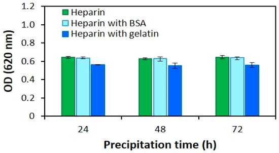 The optical density of heparin sample (400 µg/mL) at different time points (24 h, 48 h, and 72 h) during the precipitation process of heparin-AB. The concentration of proteins was 5 mg/mL. The values given represent the means ± SD and mean (n = 3).