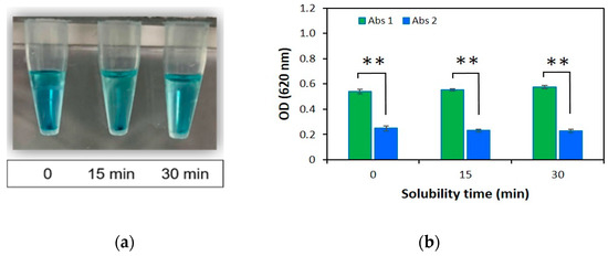(a) Appearance of the samples in solubility time study, and (b) The optical density of heparin sample (400 µg/mL) at different time points (0 min, 15 min, and 30 min) before and after dilution with the third solvent component, respectively. The data are shown as mean ± SD N = 3 and ** P < 0.01.