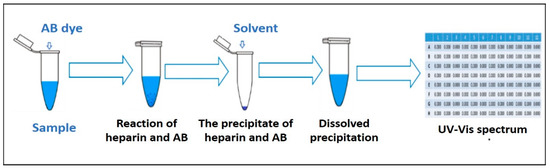 AB has been one of the most widely used cationic dyes for acidic polysaccharides such as sGAGs since 1960. The AB method is based on the formation of a deep blue complex between negatively charged sGAGs and positively charged AB that precipitates out. It was reported that the heparin and AB precipitate is insoluble in water as the ionic bonding between sGAG and AB is a stable interaction [22,23]. As a tetravalent cation—with a hydrophobic core with positive charges attached strongly to heparin—the ionic strength and presence of other interactions affect the precipitate in solution [29].