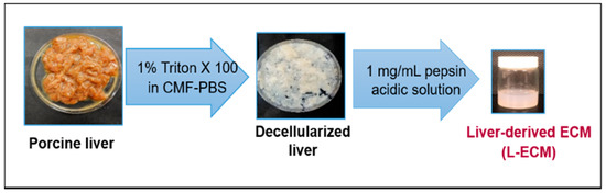 The liver was depleted of blood in a fresh state with calcium and magnesium-free phosphate-buffered saline (CMF-PBS) and cryopreserved at −80 °C until use. A porcine liver was sliced to 1 cm × 1 cm × 2 mm pieces using a mandolin-style slicer and decellularized using 1% Triton X-100 in CMF-PBS at 4 °C for 3 days to remove the cellular components. The solution was changed each day for 3 days under constant stirring to maintain the efficiency of decellularization. The resulting decellularized liver was immersed in CMF-PBS at 4 °C for 4 days to remove the detergent. Dialysis was performed to remove salts and impurities using the Spectra/Por 6 dialysis membrane (MCWO: 1000, Spectrum Laboratories, Inc., Milpitas, CA, USA). Finally, lyophilization was done for 24 h to remove moisture. The dried L-ECM was powdered in a mill mixer and 10 mg of dried L-ECM powder was solubilized in 1 mL of pepsin solution (1 g/mL in 0.01 N HCl) and then constantly stirred for 3 days at 4 °C. After that, the ECM solution was centrifuged to remove the supernatant and dialyzed with 1 L ultrapure water for 24 h. The resulting L-ECM pre-gel (pH = 3.0–4.0) was stored at 4 °C until further analysis. All animal experiments were performed in accordance with the guidelines of the Ethics Committee on Animal Experiments and accepted by Kyushu University (A27-326-0, 19 February 2016).