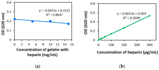 Calibration curves for (a) 100 µg/mL of heparin with 5 mg/mL, 10 mg/mL and 15 mg/mL of gelatin sample, and (b) Results were obtained from the concentration range of 12.5–400 µg/mL used for the heparin standard. The R squared value was calculated, and the values depicted represent the mean (n = 3).
