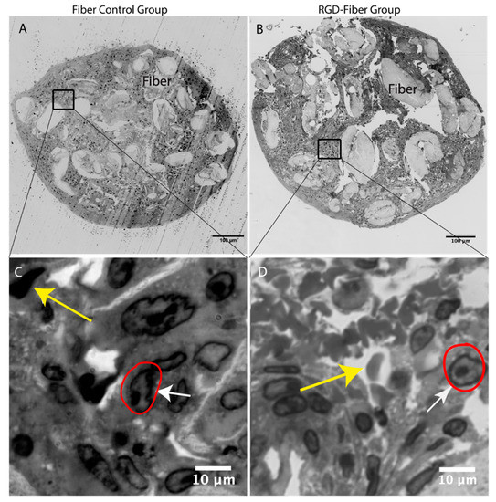 Toluidine blue staining of midline sections of (A) control fibers and (B) RGD-fibers imaged at 20× shows the presence of regenerated nerve tissue. Toluidine blue staining on midline sections imaged at 100× of (C) control fiber and (D) RGD-fiber samples (from boxed regions from A and B, respectively) showing myelinated axons (white arrow with red circle), fibers, and red blood cells (yellow arrow).