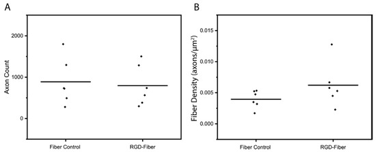 Axon count (A) from whole sections of toluidine blue-stained sections (n = 6 nerves). Control fibers were associated with an average of 886.5 ± 561.0 axons, and RGD-fiber with 794.7 ± 493.3 axons per whole nerve section. The groups were not significantly different. Axon fiber density (B) was 0.003953 ± 0.001412 axons/µm2 for the control fiber group, and 0.006214 ± 0.0003539 axons/µm2 for the RGD-fiber group. No significant differences were found between the groups. The total nerve sections used for the analysis can be seen in Figure S4.
