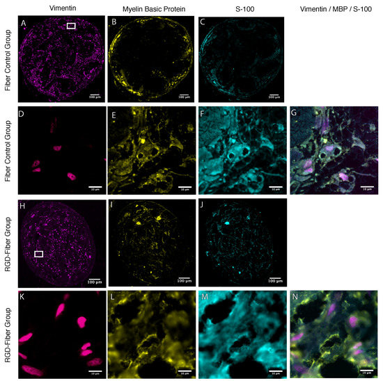 Immunohistochemical staining shows myelin basic protein (yellow), vimentin (magenta), and S-100 SC label (cyan) in midline sections from six-weeks samples of RGD-fibers (H–N) and control fibers (A–G). Both fiber groups showed similar presence of myelin basic protein (B,E,I,L), vimentin (A,D,H,K), and S-100 (C,F,J,M) at the midline, with myelin basic protein and S-100 labeling similar structures. Further magnified (100×) images from the boxed region in (A) and (H) for each group, respectively, to show specificity and overlap of the labels, including merged images at 100× (G,N).
