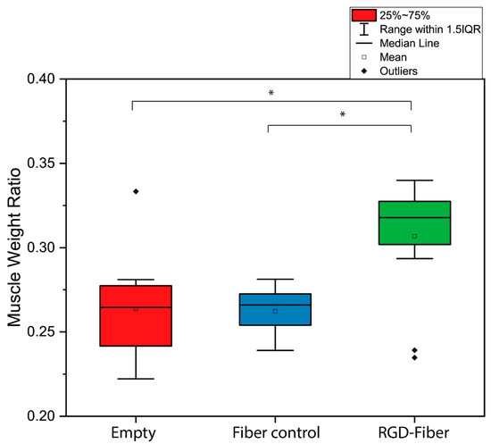 Muscle weight ratio at week 6. The RGD-fiber group had significantly less atrophy compared to the control fiber and to the empty conduit groups (p = 0.045 and p = 0.020). Significant differences were not found between the control fiber and the empty conduit groups. Outliers in the empty group (muscle weight ratio = 0.33) represented a conduit with nerve tissue formation via gross evaluation. (* denotes p < 0.05).