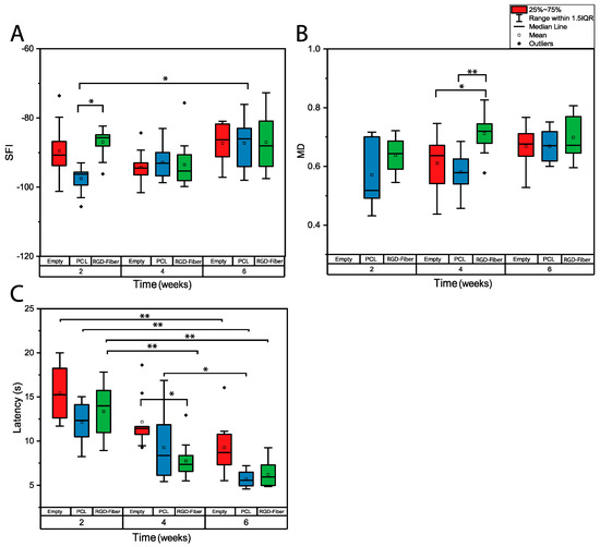 Motor and sensory functional data over the six weeks of the study. The sciatic function index (SFI) (A) and extensor postural thrust (EPT) (B) are presented for each group over time. As function improved, the SFI values became less negative. After two weeks, the RGD-fiber group was found to be significantly different from the control fiber group (p = 0.002). Animals with control fibers were found to improve significantly from week 2 to week 6 (p = 0.003). As function improved, the EPT values decreased. Significant differences were found between the RGD-fiber group and the empty conduit and control fiber groups at week 4 (p = 0.045 and p = 0.001, respectively). Sensory improvement (C) was demonstrated by a decrease in latency (s). As function improved, the latency decreased to pre-surgery values (Figure S7). In all groups, latency significantly decreased from two to six weeks (empty p ≤ 0.001, control fiber p ≤ 0.001, and RGD-fibers p ≤ 0.001); however, only the RGD-fiber group improved significantly from week 2 to week 4 (p ≤ 0.001). At week 4, animals with RGD-fibers showed significantly more recovery than those with empty conduits (p = 0.005). The control fiber group recovered significantly from week 4 to week 6 (p = 0.032) (* denotes p < 0.05 and ** denotes p ≤ 0.001).