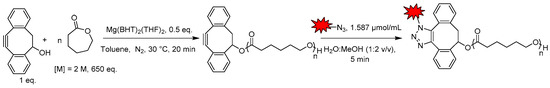 DIBO-end-functionalized poly(ɛ-caprolactone) was synthesized (Scheme 1), electrospun, and modified with GRGDS peptide using methods described previously [24]. Briefly, using standard drying techniques, an ampoule was filled with ɛ-CL (0.3340 mol, 37.01 mL), DIBO (0.5148 mmol, 113.25 mg), toluene (120.93 mL), and Mg(BHT)2(THF)2 (0.285 mmol, 173.00 mg). The ampoule was sealed and heated at 30 °C for 20 min. The polymerization was quenched with the addition of acidified (5% v/v HCl) methanol, dissolved into chloroform, and precipitated into cold methanol. The crude polymer was re-dissolved in methylene chloride and dried under high vacuum. The purified polymer was then stored in a desiccator. The monomer conversion (~100%) and the product (yield 77%) were confirmed by 1H NMR spectroscopy (Figure S1), UV–visible spectroscopy, and SEC (Figure S2, Mn = 50,800 Da, Mw = 68,600 Da, ĐM = 1.35).