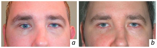 Frontal view of the patient K.: (a) preoperative asymmetric palpebral fissure, hypoglobus and enophthalmos; (b) follow up (six months after surgery) evident ocular symmetry with correction of hypoglobus and enophthalmos in his right eye.