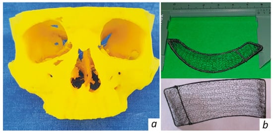 Based on preoperative planning, the customized endograft is fabricated following the volume of upcoming repair as recommended in References [7,10,27]. Each KTNM is made of the TN-10 alloy superelastic filaments (60 µm in diameter), having a microporous, oxicarbonitride superficial layer [29,30]. The bio-mimic in vitro/vivo features of TiNi-based constructs have been reported to resemble the behavior of human body tissues [26,31]. The light mesh is double knitted by a process which interlinks each filament junction and provides for superelasticity in any direction, as indicated in [10]. Using the data personally acquired from CT scans and CAD modelling, the 3D model depicted in Figure 2a is printed out. Since such mesh enables us to get any desired shape or size without unravelling, it is then draped over the plaited frame made of the same alloy twisted wires (200 µm in diameter) according to the produced 3D model, aligned, and stitched. Finally, the KTNM, as seen in Figure 2b, which accurately reproduces the orbital contours to be repaired, is sterilized by gamma irradiation and kept in a sterile pack. Note that once the 3D model has been printed out the sterile KTNM would normally be dispatched the next day to a hospital.