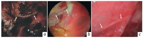 In the follow-up period, the reparative process in the treated orbital area was endoscopically monitored, as shown in Figure 4. On the fifth day the implantation zone was covered with fibrin. The implant site is seen to be not covered with tissues of the recipient area, whereas clots and granulation tissue are pointed out. On the twenty-first day, the wound surface seems to be completely cleared of necrotic masses and fibrin. Granulation tissue formation continued, and epithelialisation at the wound margin was noted. The KTNM was completely epithelialized within one month after surgery. No inflammatory changes were observed in the recipient zone.