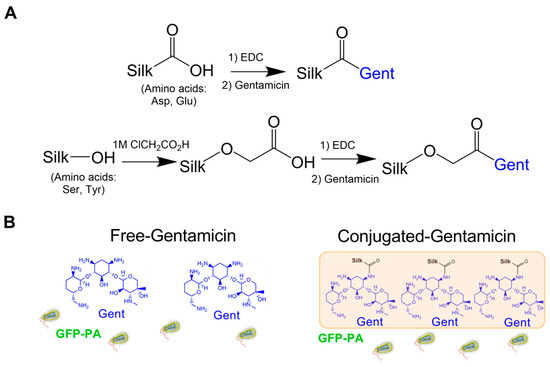 Development of gentamicin-conjugated silk scaffolds. (A) Reaction schemes showing 1-ethyl-3-(-3-dimethylaminopropyl) carbodiimide hydrochloride (EDC)-mediated coupling of native silk to form a covalent bond between gentamicin and aspartic acid and glutamic acid residues, and carboxyl-enrichment mediated followed by EDC coupling of gentamicin to free reactive carboxylic groups; (B) Proposed application of gentamicin-silk films in the treatment of bacterial infection by P. aeruginosa. Free-gentamicin applied to conditioned media results in dispersed drug availability with bactericidal effects mediated primarily via ribosomal inhibition. Conjugated silk–gentamicin films immobilize gentamicin to the surface of the scaffold, thereby providing a consistent antimicrobial surface. Bacteria pictorial was obtained from Servier Medical Art available at https://smart.servier.com based on a Creative Commons Attribution 3.0 Unported License.