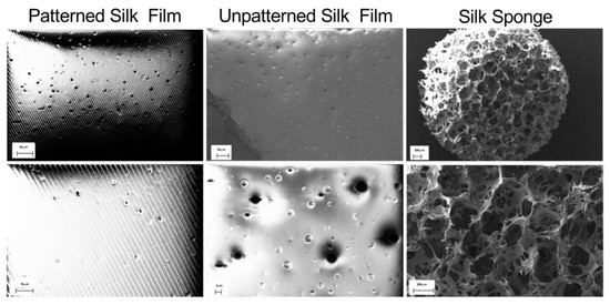 Topographical characterization of silk scaffolds using scanning electron microscopy (SEM). Polyethylene oxide (PEO)-generated pores (3–5 μM diameter) are evident on both patterned and unpatterned silk films. The porous silk sponge shows large cavities generated using salt-leaching (500–600 μM salt-particle diameter).