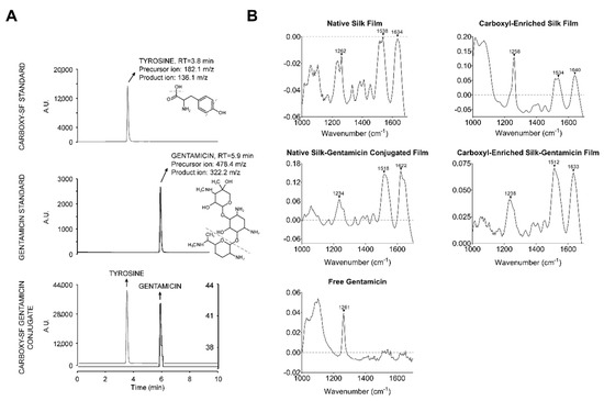 Liquid chromatography-tandem mass spectrometry (LC-MS/MS) and infrared (IR) spectra of silk controls and gentamicin-loaded silk scaffolds. (A) Confirmation of elution times and fragmentation patterns of the tyrosine ion in carboxyl-enriched silk standard (top) and gentamicin ion in gentamicin standard (middle); the presence of both ions in carboxyl-enriched silk gentamicin conjugate films confirms successful conjugation (bottom); (B) IR spectra of silk and gentamicin-loaded silk films and relevant controls. Carboxyl-enriched silk was cast onto a polydimethylsiloxane (PDMS) mold and analyzed by IR spectra.