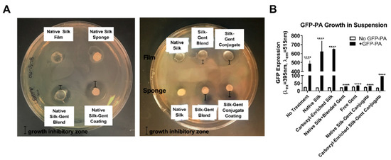 Bactericidal effects of gentamicin-loaded silk biomaterials. (A) Growth inhibitory assay using lysogeny broth (LB) agar containing 100 μg/mL ampicillin and inoculation with green fluorescent protein GFP-PA. Small discs of silk scaffold controls (silk films or sponges) or gentamicin-loaded scaffolds (blended, coated, or conjugated) were applied to the surface on a PDMS mold with inhibitory zone of bacterial growth visualized under brightfield at t = 24 h post-inoculation; (B) Quantification of total planktonic GFP-PA growth in epithelial media assessed spectroscopically based on GFP total fluorescence at t = 6 h post-inoculation with different treatments. Soluble solutions (native silk, carboxyl-enriched silk, carboxyl-enriched silk-gentamicin conjugate, and free gentamicin) and films (native silk + blended gentamicin and native silk–gentamicin conjugate) at concentrations of 1% w/v silk were tested to determine effectiveness at inhibiting bacterial growth. n = 3. Error bars represent standard error of the mean. **** p ≤ 0.0001 based on a two-way analysis of variance (ANOVA).