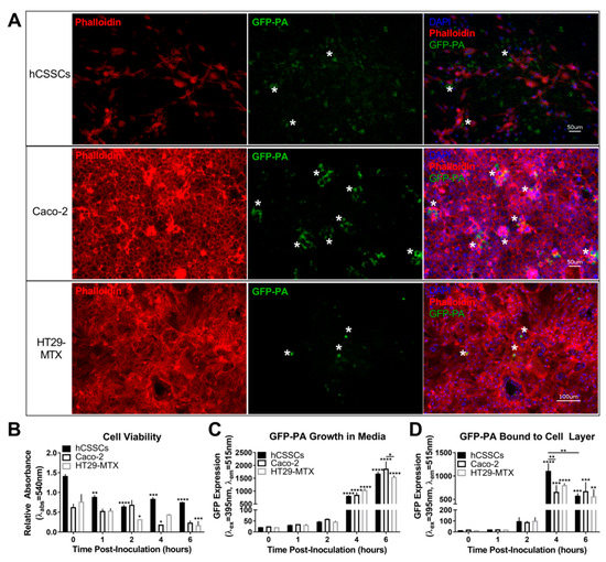 We investigated the susceptibility of stromal (hCSSCs) and mucosal cell types (Caco-2 and HT29-MTX) to P. aeruginosa adhesion and cytotoxicity in order to establish a baseline for evaluating therapeutic effectiveness. We inoculated cultures of hCSSCs, Caco-2, and HT29-MTX with GFP-PA and analyzed for adhesion of the bacteria at t = 4–6 h post-inoculation (Figure 5A).