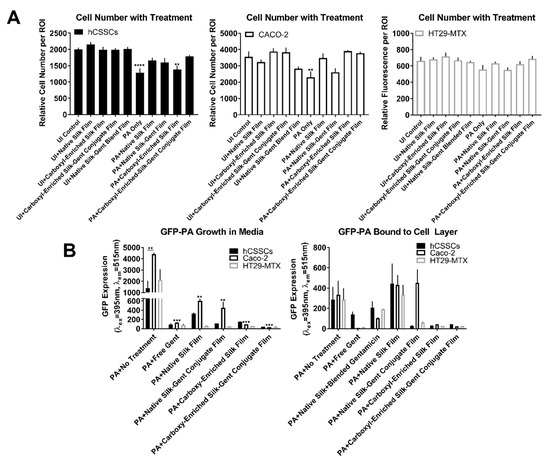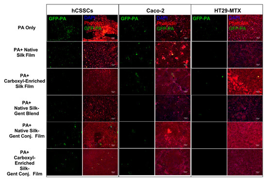 Therapeutic effectiveness in the context of protection against stromal and mucosal cell loss during infection was determined by applying water-annealed silk films with and without gentamicin blended or conjugated to the surface of hCSSCs, Caco-2, and HT29-MTX cultures followed by GFP-PA inoculation. Post-6 h, P. aeruginosa growth was apparent in untreated groups, native silk control, and native silk–gentamicin conjugated samples (Figure 6).