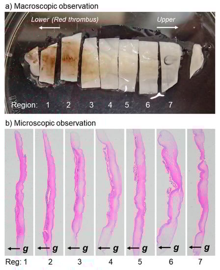Macroscopic observation of a compressed and fixed A-PRF membrane. (a) This PRF membrane was divided into seven pieces, designated as region 1 to 7, where region 1 represents the region closest to the red blood cell fraction. (b) Microscopic observation of A-PRF cross-sections obtained from individual regions. Cross-sections were stained with Hematoxylin and eosin (HE). To confirm morphological similarity, the magnitude of sections was modified to adjust their lengths at similar levels. Arrows represent the direction of gravity force.
