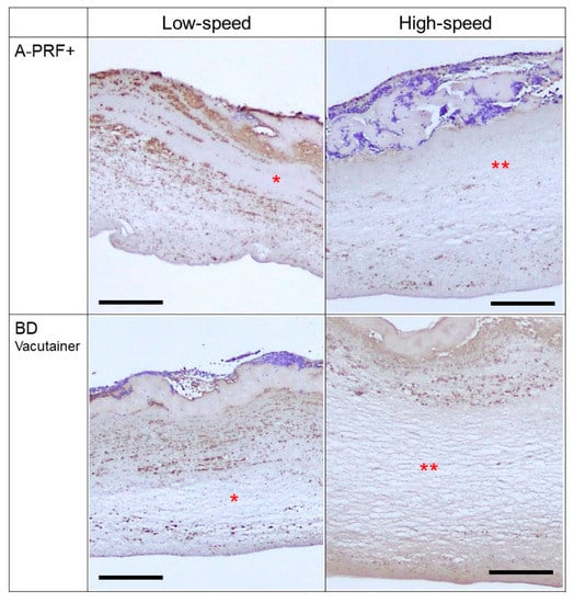 The following are available online at https://www.mdpi.com/2079-4983/10/3/43/s1, Figure S1: Platelet distribution in PRF matrix prepared using glass A-PRF+ tubes by low- (a: A-PRF protocol) and high-speed centrifugation (b: CGF protocol). Sections from regions (Reg.) 2, 4, and 6, stained with HE (left panels) or using anti-CD41 antibody (right panels) are shown. CD41+ platelets are stained dark brown, Figure S2. Platelet distribution in PRF matrix prepared using glass Vacutainer tubes by low- (a: A-PRF protocol) and high-speed centrifugation (b: CGF protocol). Sections from regions (Reg.) 2, 4, and 6, stained with HE (left panels) or using anti-CD41 antibody (right panels) are shown. CD41+ platelets are stained dark brown, Figure S3. Platelet distribution in PRF matrix prepared using plastic tubes containing silica-coated film (Venoject II) by low- (a: A-PRF protocol) and high-speed centrifugation (b: CGF protocol). Sections from regions (Reg.) 2, 4, and 6, stained with HE (left panels) or anti-CD41 antibody (right panels) are shown. CD41+ platelets are stained dark brown, Figure S4. Platelet distribution in PRF matrix prepared using plastic, silica-coated tubes (Neotube) by low- (a: A-PRF protocol) and high-speed centrifugation (b: CGF protocol). Sections from regions (Reg.) 2, 4, and 6, stained with HE (left panels) or using anti-CD41 antibody (right panels) are shown. CD41+ platelets are stained dark brown.