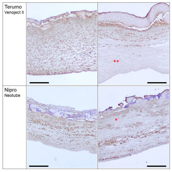 Figure S4 shows the platelet distribution in a PRF matrix prepared using silica-coated plastic tubes (Neotube) by low- (Figure S4a: A-PRF protocol) and high-speed centrifugation (Figure S4b: CGF protocol). As with the other tube types, low-speed centrifugation distributed CD41+ platelets diffusely throughout the PRF matrix. High-speed centrifugation also distributed CD41+ platelets well homogenously in both peripheral and deep regions.