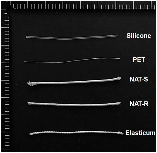 For the current experiment, the Elasticum®, a non-absorbable elastic suture material that is made of silicone and sheathed with PET, served as a control material [16,17]. In addition, the NAT served as a trial material. Depending on its surface properties, it is classified as NAT-R (rough surface) and -S (smooth surface). Experimental materials are summarized in Table 1. Prior to the experiment, both the control and trial materials were assessed for the measurement of dimensions that include the diameter and surface smoothness or roughness, as illustrated in Figure 1.