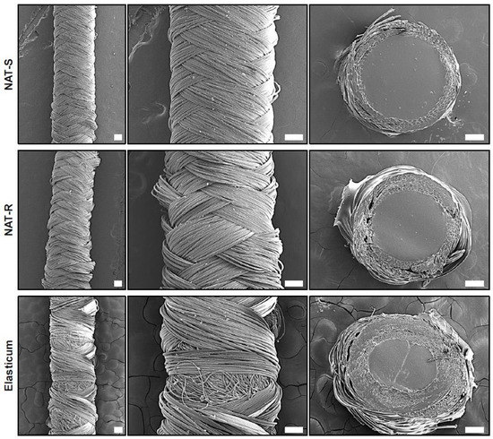 On FE-SEM, both NAT-R and -S were observed to be braided in a regular weave, but the Elasticum® was not after elongation. The white bar indicates the scale of 200 µm.