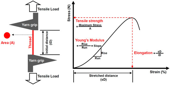 The current experiment was performed in accordance with the American Society for Testing and Materials (ASTM) D2256 (Standard Test Method for Tensile Properties of Yarns by the Single-Strand Method) [18]. In more detail, this method covers the measurement of tensile properties of monofilament, multifilament, and spun yarns, either single, plied, or cabled with the exception of yarns that stretch more than 5.0% when there is an increase in the tension from 0.05 to 1.0 cN/tex (0.5–1.0 gf/tex). Moreover, it also covers the measurement of the breaking force and elongation of yarns and then calculation of the breaking tenacity, initial modulus, chord modulus and breaking toughness. Guidelines for the current experiment are applicable to straight, knotted, and looped specimens. Finally, experimental conditions include those for specimens that are (1) conditioned air; (2) wet, not immersed; (3) wet, immersed; (4) oven-dried; (5) exposed to elevated temperature; or (6) exposed to low temperature [18].