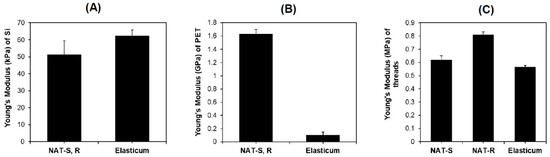 Young’s modulus. (A) Young’s modulus of Si was 51.39 ± 8.08 kPa in NAT and 62.40 ± 3.38 kPa in Elasticum®. (B) Young’s modulus of PET was 1.63 ± 0.07 GPa in NAT and 0.10 ± 0.05 GPa in Elasticum®. (C) Young’s modulus of braided Si/PET threads was 0.62 ± 0.03 MPa in NAT-S, 0.81 ± 0.02 MPa in NAT-R and 0.57 ± 0.01 MPa in Elasticum®. Abbreviations: NAT-R, non-absorbable thread with a rough surface; NAT-S, non-absorbable thread with a smooth surface; Si, silicone; PET, polyester.