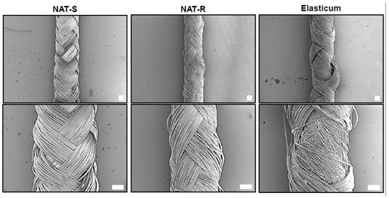 The SEM findings of the experimental materials after elongation are shown in Figure 5. This showed that both the NAT-R and -S were observed to be braided in a regular weave.