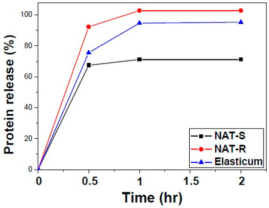 - The degree of BSA release was significantly higher in NAT-R as compared with Elasticum® and NAT-S throughout a 2-h period in the descending order (p < 0.05).