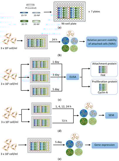 Simple diagrams exhibiting a protocol of each experiment performed in this research. (a) Polycaprolactone (PCL) scaffold preparation; (b) Initial cell attachment assay; (c) Cell proliferation and attachment assays by enzyme-linked immunosorbent assay (ELISA); (d) Observation of cellular attachment under scanning electron microscopy (SEM); (e) Gene expression by semi-quantitative polymerase chain reaction (PCR).