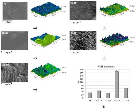 The SEM picture displayed difference surface topography among the type of scaffolds, while the AFM visualized and analyzed the RMS roughness, and then the data was plotted (Figure 3). The roughest surface was observed in 3D-TP, with the significant highest amplitude (approximately 160 nm) (Figure 3d,f). The 3D-NP also significantly displayed the different roughness from PS control (approximately 60 nm) (Figure 3e,f). However, there was equivalent RMS roughness among PS, 2D-TP, and 2D-NP (Figure 3a–c,f).