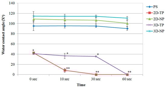 The surface hydrophilicity of the PCL scaffolds increased in comparison to PS, 2D-NP, and 3D-NP after oxygen plasma surface treatment, observed from a decrease in the water contact angle (X°) at 0 s (Figure 4). 3D-NP exhibited the highest water contact angle, followed by 2D-NP and PS. No significant differences were found between the non-plasma-treated PCLs and PS. However, the water contact angle of all materials declined over time. The smallest contact angle was observed for 2D-TP, which was completely wet at 30 s, compared with 60 s for 3D-TP.