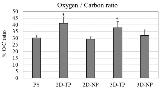 From the chemical composition analysis in a number of oxygen and carbon atom by XPS, percent oxygen/carbon ratio (% O/C ratio) of the material surface was calculated and plotted (Figure 5). The highest % O/C ratio was observed in both 2D-TP and 3D-TP, which was statistically different from 2D-NP, 3D-NP, and PS.