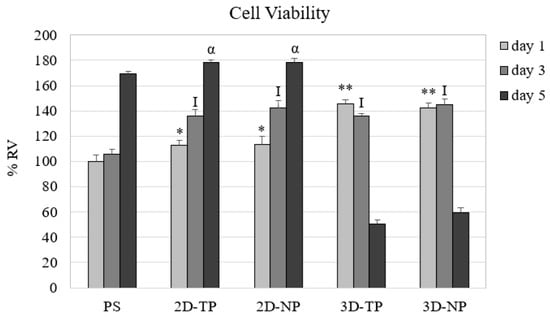 Percent relative cell viability (% RV) from the culture of day one, three, and five on different scaffolds. The symbols on the top of the bar represented significant differences (p ≤ 0.05) in % RV among the scaffolds on day one (*, **), three (I), and five (α).