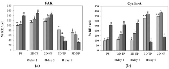 Percent relative expression per cell (% RE/cell) of Focal adhesion kinase: (a) FAK and (b) cyclin-A proteins by hWJMSC cultured on different scaffold types for days one, three, and five, as evaluated by enzyme-linked immunosorbent assay (ELISA). The symbols above the bars represented significant differences (p ≤ 0.05) in % RE among the scaffolds at day one (*, **), day three (a, b, c), and day five (I, II).