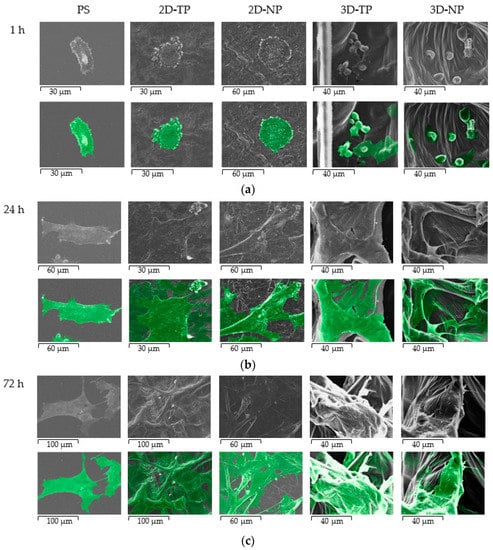 SEM Photomicrograph of hWJMSC morphology on PS, 2D-TP, 2D-NP, 3D-TP, and 3D-NP, at various times of culture: (a) 1 h, (b) 24 h, and (c) 72 h. The second row of each time point indicates the cell boundary and position on the scaffolds (exhibited in green).