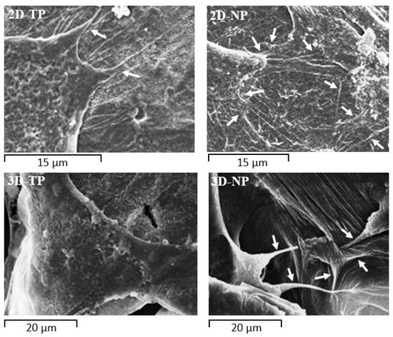 Filopodial protrusions (white arrows) extending from the cytoplasmic edge at 24 h of culture on PCL scaffolds. Cells on 2D-NP and 3D-NP scaffolds extended more numerous filopodia than cells on 2D-TP and 3D-TP, respectively.