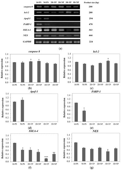 (a) Polymerase chain reaction (PCR) products were electrophoresed on agarose gels. The PCR product size of each gene is shown in the right column. Band intensity was used as a semi-quantitative measure of gene expression level after five days in culture and calculated to relative expression of the apoptosis/necrosis-related genes; (b) caspase 8, (c) bcl-2, (d) Apaf-1, and (e) PARP-1, and the pluripotency/differentiation-related genes—(f) SSEA-4 and (g) NES. The asterisks (*, **, ***) on the top of the bars represented significant differences (p ≤ 0.05) in the relative expression of each gene among the scaffolds in comparison to 1d-PS.