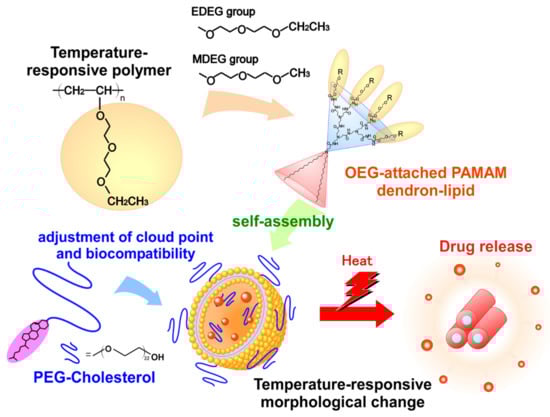 Schematic image of OEG-attached PAMAM dendron-lipid assembly as temperature-responsive nanocarrier.