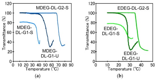 Change in transmittance of OEG-attached PAMAM-DLs dispersions with an increase in temperature. (a) MDEG-attached PAMAM-DLs, (b) EDEG-attached PAMAM-DLs. OEG-attached PAMAM-DLs were suspended in 10 mM phosphate and 140 mM NaCl at pH 7.4.