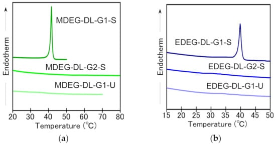 Cloud points of OEG-attached PAMAM-DLs decreased as the terminal group became more hydrophobic from methoxy to ethoxy and the cloud point increased as the generation of dendron increased from first to second generation. Li et al. evaluated the effect of OEG moieties to cloud points of OEG-attached dendrimer and dendronized polymers [,]. They confirmed that the change of terminal groups from methoxy into ethoxy showed strong influence on cloud points, in which the polymers bearing ethoxy terminal of the OEG moiety showed low cloud point compared with the case of methoxy terminal. We have also reported similar effects of terminal groups on OEG-attached hyperbranched polyglycidols []. Increase in cloud point with an increase in dendron generation might be due to hydrophilicity of interior of PAMAM dendron including tertiary amines and amides. The effect of hydrophilicity of dendron interior was evaluated through pH-dependence of cloud points of EDEG-DL-G2-S (Figure S2). Although cloud points were kept constant (35 °C) at pH 7 and higher, the decrease in pH from neutral to acidic provided an increase in cloud point. Increase of cloud point with a decrease in pH is induced by an increase in hydrophilicity and a decrease in the density of OEG moieties at the surface with protonation of tertiary amine in the dendron interior. Additionally, cloud points are influenced by hydrocarbon chains of OEG-attached PAMAM-DLs. Because it is known that the saturation of hydrocarbon chains of lipids influences to their membrane characters including fluidity, molecular packing. OEG-attached PAMAM-DLs bearing unsaturated hydrocarbon chains showed lower cloud points compared with OEG-attached PAMAM-DLs bearing saturated hydrocarbon chains. This might be due to the difference in the fluidity of lipid bilayer. DSC measurements were performed for OEG-attached PAMAM dendron-lipids self-assembly (Figure 3). Endothermic peaks were detected for MDEG-DL-G1-S and EDEG-DL-G1-S, but there were no peak in the case of the other OEG-attached PAMAM dendron-lipids. Endothermic peaks for MDEG-DL-G1-S and EDEG-DL-G1-S were detected at 41.5 °C and 40.0 °C, respectively, and these temperatures were different with cloud points. That is, these endothermic peaks in DSC charts are not due to dehydration of the OEG unit attached to PAMAM-DLs, but to the gel-to-liquid crystalline transition of the alkyl chains, indicating that the alkyl chains of MDEG-DL-G1-S and EDEG-DL-G1-S took typical molecular packing in lipid bilayer. In the following experiments combined with PEG-Chol, EDEG-DL-G1-S was selected considering lipid molecular membrane formation and the adjustment of cloud point to around body temperature.