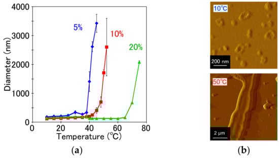 Recent advancement in nanocarrier-based drug delivery system has contributed to therapeutic strategies. In the design of nanocarriers, stimuli-responsivity is important for controlled drug delivery. Stimuli are classified into endogenous stimuli such as pH decrease, high glutathione concentration and matrix metalloproteinases and external stimuli such as light, ultrasound and magnetic field [,,,,]. In particular, temperature-responsive nanocarrier system using external stimuli are one of the most widely investigated stimuli-responsive strategies because heat is easy and safe to use for hyperthermia and controlled drug delivery []. As temperature-responsive nanocarrier system, the molecular assemblies including micelles and vesicles composed of amphiphilic polymers and molecules are widely investigated, and it was reported that temperature-responsive liposomes showed effective therapeutic effect for the local release of drugs by combining with hyperthermia [,].