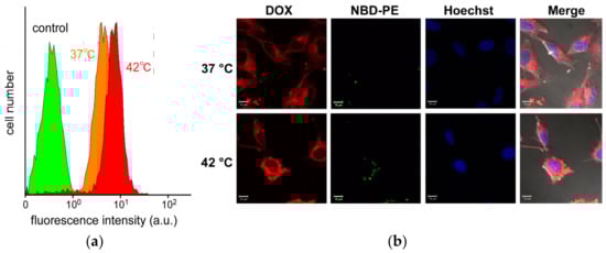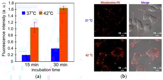 Thin membrane composed of EDEG—DL-G1-S, PEG−Chol and rhodamine−PE (95/5/0.6, mol/mol/mol) was prepared to obtain fluorescent-labeled DL assemblies, and then, fluorescent-labeled EDEG-DL-G1-S/PEG−Chol assemblies were prepared by dispersing PBS. HeLa cells (1.0 × 105 cells) cultured overnight in a 12-well plate were washed with PBS containing 0.36 mM CaCl2 and 0.42 mM MgCl2 (PBS(+)) and then incubated with culture medium. rhodamine−labeled PAMAM-DL assemblies or DOX-loaded PAMAM-DL assemblies were added to cells incubated for 15 min at 37 °C or 42 °C (5.0 µg DOX/mL). The cells were then rinsed with PBS(+) three times. The detached cells using trypsin were analyzed by a flow cytometer (EPICS XL, Beckman Coulter Inc., Brea, CA, USA).