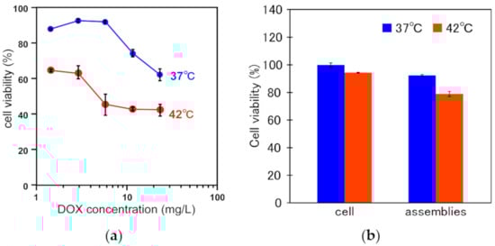 Finally, the cell viabilities of HeLa cells treated with DOX-loaded EDEG-DL-G1-S/PEG-Chol assemblies at 37 °C and 42 °C were evaluated by MTT assay (Figure 7a). When the cells were incubated with DOX-loaded assemblies at 37 °C, high cell viabilities were maintained at low DOX concentration and the cell viability decreased at a DOX concentration of 10 mg/L or more. The cell viabilities at 42 °C were decreased compared with those at 37 °C, and this was due to an increased taken-up amount of DOX (Figure 6a) and difference in intracellular distribution of DOX (Figure 6b). Also, EDEG-DL-G1-S/PEG-Chol assemblies without DOX loading were negligible cytotoxicity (Figure 7b). These results indicated the utility of EDEG-DL-G1-S/PEG-Chol assemblies as temperature-responsive nanocarrier.