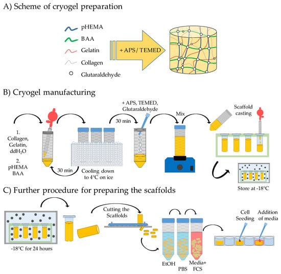 Schematic overview of scaffold production. (A) Formation of a scaffold matrix through the cross-linking of the scaffold components. (B) Mixture of the individual scaffold components and pouring of the scaffolds. (C) Further procedure, cutting the scaffolds, preparation of the scaffolds prior to cell cultivation, and seeding of the cells.