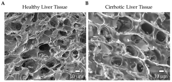 To develop scaffolds corresponding to the healthy and fibrotic liver, it is necessary to characterize the respective in vivo environments and then develop an in vitro model representing these characteristics. Therefore, we captured SEM images of healthy and cirrhotic liver tissue samples (Figure 2A,B). The images show that there are differences between the structure of the ECM of the healthy and cirrhotic liver. The ECM of the healthy liver is, as described before [], an open-pored, thin-walled structure (Figure 2A), while the cirrhotic tissue has thicker cell walls and slightly larger pores (Figure 2B).