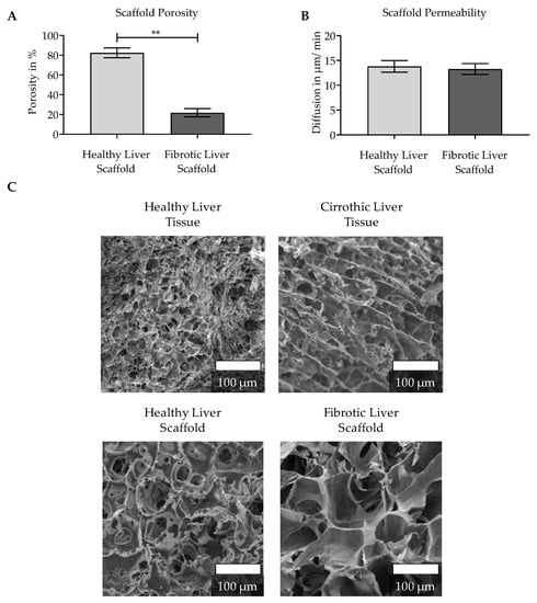 Physical characterization of the pHEMA/BAA-based 3D scaffolds: (A) Determination of the scaffold porosity (n = 5), three scaffolds were pooled and measured together. (B) Permeability was measured in a total of 9 scaffolds from three independent scaffold manufacturing days. Bars represent mean ± SEM; p < 0.01 (**) as indicated. (C) SEM images of healthy liver and cirrhotic altered liver tissue and both selected scaffolds (scale bar 100 µm).