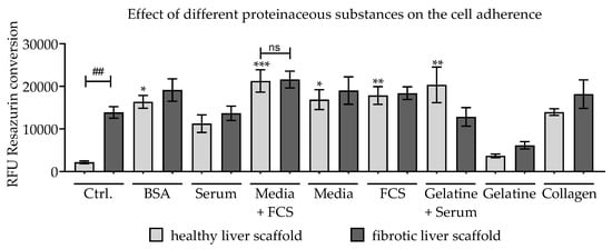 Effect of pre-incubation with various proteinaceous substances. Scaffolds were pre-incubated for at least 7 days with the Arg-Gly-Asp (RGD)-containing solutions. Resazurin conversion was measured 24 h after plating 2 × 105 HepG2 cells/scaffold on pre-coated scaffolds; scaffolds pre-incubated in PBS were used as a control; N = 3, n = 2. Bars represent mean ± SEM. The significance of differences between pre-incubation with PBS (control) and proteinaceous substances is denoted as follows: *p < 0.05, **p < 0.01, ***p < 0.001. The difference between the not pre-incubated healthy and fibrotic liver scaffold is indicated as ##p < 0.01. The difference between the media and FCS pre-incubated healthy and fibrotic liver scaffolds are indicated as not significant (ns).