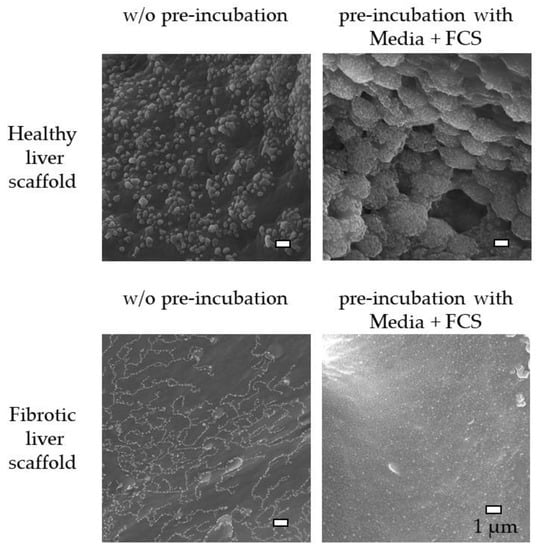Effect of pre-incubation on the surface of the scaffolds. Representative SEM images of the surface of healthy and fibrotic liver scaffolds with and without (w/o) 7-day pre-incubation in FCS-containing medium (scale bar 1 µm).